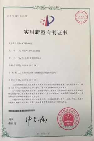 恭賀我公司產品礦用裝藥器于2017年5月3日再次獲得國家專利證書 專利證號:ZL 2016 2 1185302.1