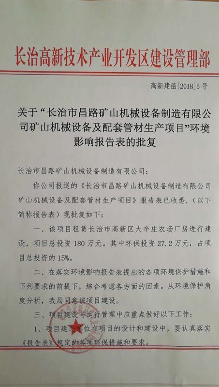 關(guān)于“長治市昌路礦山機(jī)械設(shè)備制造有限公司礦山機(jī)械設(shè)備及配套管材生產(chǎn)項(xiàng)目”環(huán)境影響報(bào)告表的批復(fù)
